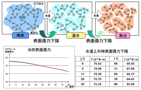 被活性化的水其特徵就是表面張力下降。經陶瓷處理過的水20℃的水與50℃溫水的洗淨能力相當。洗淨力提升代表清潔劑用量降低。實驗證明洗淨能力提升、溶解力、滲透力等的提升也可以期待。